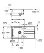 • външен радиус: R6 (стандартен монтаж), вътрешен радиус на корито: R75