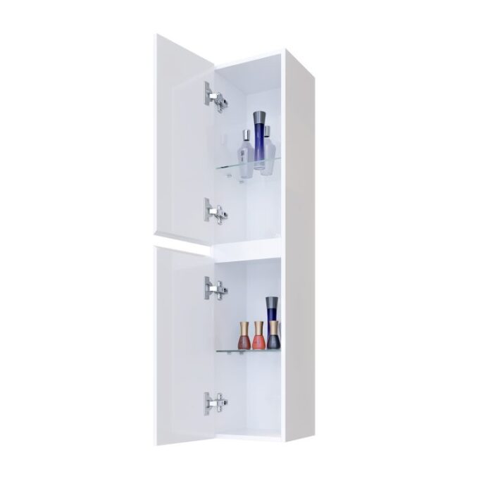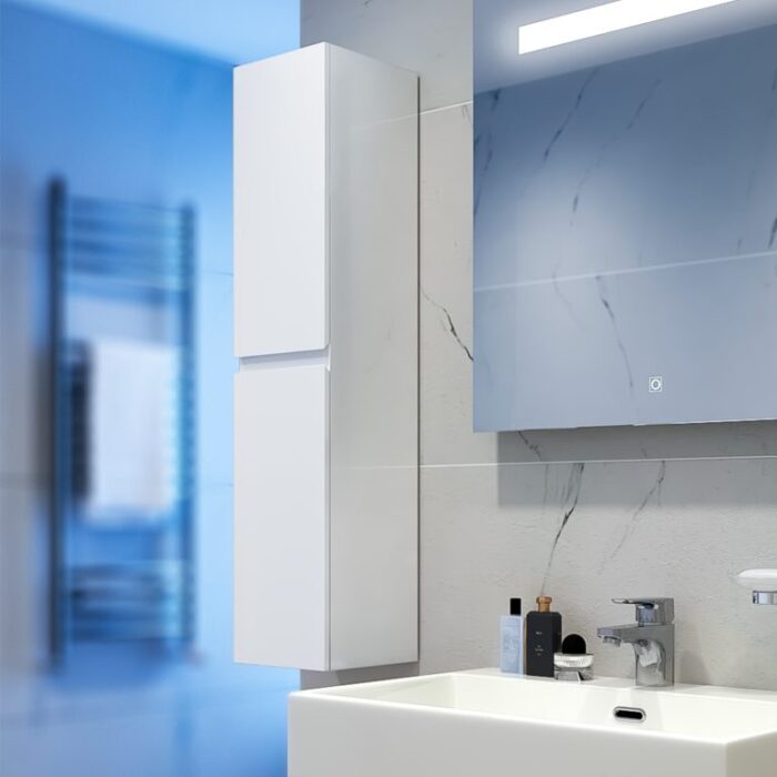 Съвършено водоустойчив комплект шкафове за вашата баня. Долен шкаф с две чекмеджета и вратичка, които предлагат практично разпределение на пространството. Модерно огледало с вградено LED осветление и Touch бутон. Допълнителна колона, която предлага много място за съхранение.