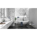 Съчетанието на големи черни ивици на бял фон, чистота и уникалност, определят елегантността на модел с мраморен ефект Iceberg с размери 60/120, представен от испанския произовдител Pamesa Ceramica.