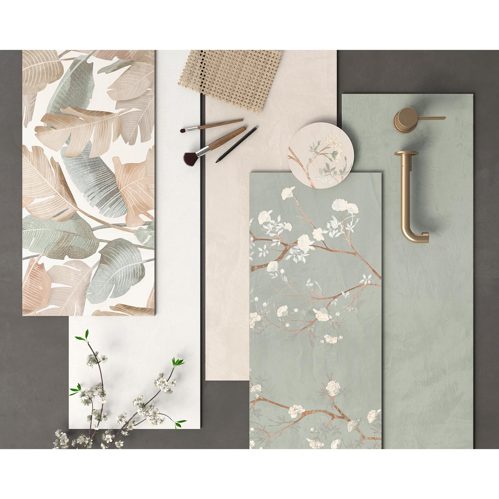 Подбраните тонове излъчват безвремие и топлина, създавайки усещане за уют и хармония в пространството. Допълнени от двете орнаментални декорации, те придават креативен и отличителен характер, превръщайки всяка стена в уникално декоративно платно.