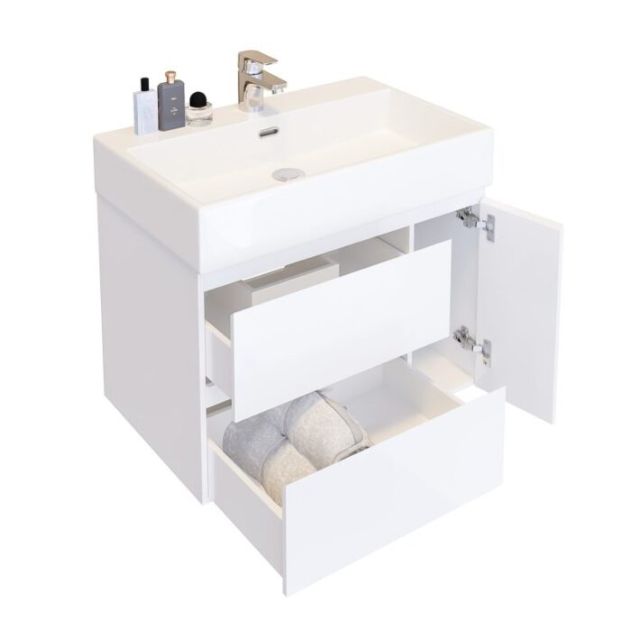 Шкафът се доставя сглобен и готов за монтаж с всички необходими крепежни елементи. Поради големината и тежестта, мивката е опакована отделно.